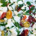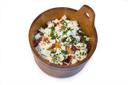 Milder griechischer Schafkäse mit Peperoni, Knoblauch, Petersilie und Olivenöl